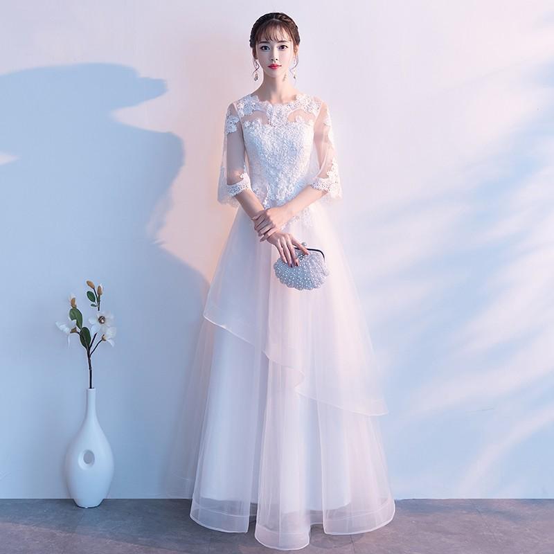 ウエディングドレス 袖あり 安い 花嫁 白 二次会 Aライン ロングドレス